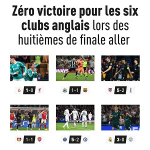 在欧冠八分之一决赛首回合比赛中,英超六支球队均未能取胜,据《队报》统计,这是自2022-2023赛季以来,英超俱乐部在该...